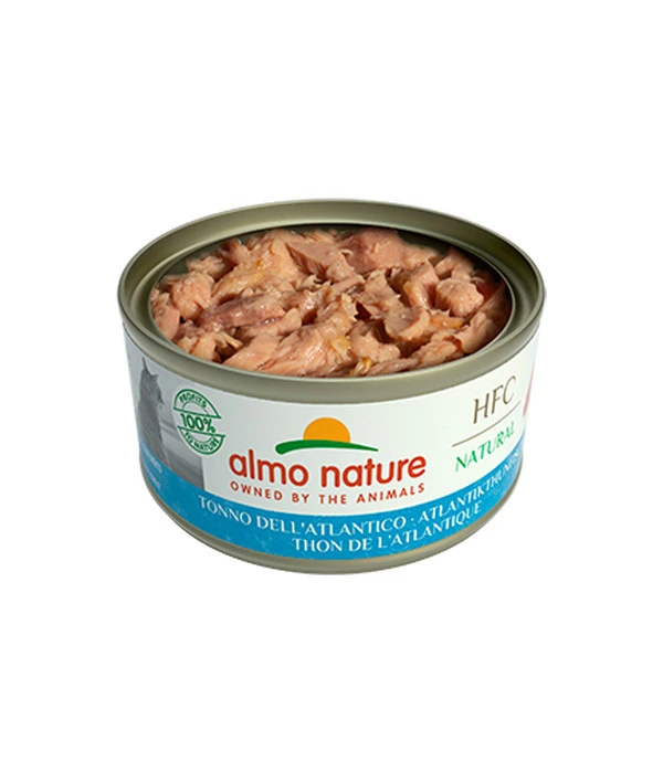 Mit almo nature Nassfutter HFC Natural Atlantikthunfisch bieten Sie Ihrer Katze kein gewöhnliches Nassfutter, denn bei dieser Nassnahrung werden nur hochwertige sowie natürliche Zutaten verarbeitet. Es überzeugt vor allem durch seinen Verzicht auf jegliche chemische Zusatzstoffe, wodurch der Geschmack des Futters einzigartig ist. Besonders durch den sehr hohen Fischanteil von 75 % erfreut sich almo nature HFC Natural Atlantikthunfisch über höchste Akzeptanz. Die im Ergänzungsfutter verwendeten HFC-Zutaten haben Lebensmittelqualität. Damit keinerlei wichtigen Nährstoffe verlieren gehen werden die Zutaten rein mechanisch verarbeitet, das Fleisch wird gekocht und geschnitten und das alles ohne chemische Behandlung. Die Konservierung von almo nature Nassfutter HFC Natural Atlantikthunfisch erfolgt in der eigenen Kochbrühe, so bleiben Nährstoffe sowie der einzigartige Fischgeschmack bestens erhalten. Dem leckeren Nassfutter kann Ihr Stubentiger nicht widerstehen. Die hochwertige Katzennahrung ist zudem glutenfrei, das Reis als Kohlenhydratquelle gewählt wurde und so ernährungssensible Katze ebenfalls in den Genuss von almo nature HFC Natural Atlantikthunfisch gelangen. Natürlich wurde das HFC Natural von almo nature so konzipiert, dass das Nassfutter auf die ernährungstypischen Bedürfnisse von Katzen angepasst ist. Mit diesem Futter verwöhnen Sie Ihren Liebling nach Strich und Faden.