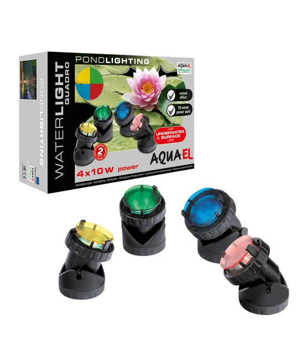 Sie lieben Ihren Teich im Garten und wollen an diesem Platz für eine ganzbesondere Stimmung in Ihrem Außenbereich sorgen? Dann ist die Teichbeleuchtung WaterLight Quadro aus dem Hause AQUAEL genau die richtige Wahl für Sie! Diesen einzigartigen Beleuchtungseffekt können Sie individuell an Ihre Farbwünsche anpassen. Jeder Scheinwerfer ist mit vier auswechselbaren Farbfiltern versehen, die Ihnen viel Abwechslung und zahlreiche attraktive Dekorationsmöglichkeiten bieten. Der verstellbare Kopf ermöglicht Ihnen eine flexible Ausrichtung des Strahlwinkels, um genau die Stellen zu beleuchten, die Sie extra in Szene setzen wollen. Ganz gleich, ob gesamter Teich, eine kleine Brücke darüber oder eine schöne Dekofigur am Ufer, das WaterLight Quadro von AQUAEL kreiert einen faszinierenden Blickfang!