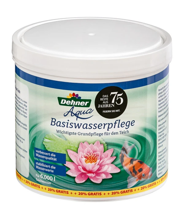 Ein sauberes Wasser ist die Grundlage eine jeden Teichs, denn je sauberer und gesünder das Wasser ist, desto besser geht es Ihren Fischen und Pflanzen. Mit unserer Dehner Aqua Basiswasserpflege haben Sie die optimale Grundlage für einen gepflegten Teich. Die Dehner Aqua Basiswasserpflege verhilft innerhalb kürzester Zeit zu einem biologischen Gleichgewicht und schafft somit einen optimalen Lebensraum für Ihre schwimmenden Lieblinge. Die im Wasser enthaltenen, für Fische giftigen Schwermetalle sowie schädliches Ammoniak werden durch die Dehner Aqua Basiswasserpflege neutralisiert, Karbonathärte und pH-Werte stabilisiert. Unsere Dehner Aqua Basiswasserpflege unterstützt die biologische Selbstreinigungskraft des Wassers, fördert das Wachstum schadstoffabbauender Mikroorganismen und fügt zudem lebenswichtiges Calcium zu, welches die Wasserqualität deutlich verbessert. So werden sich Ihre Teichfische sicher wohl fühlen.