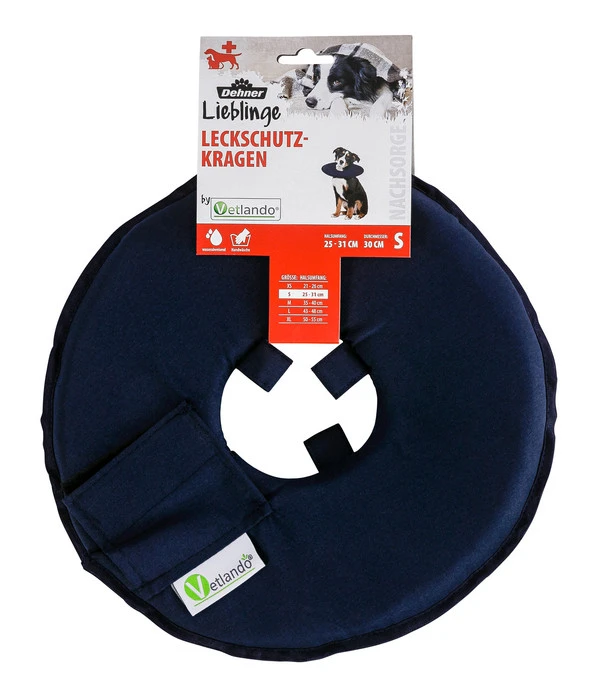 Jeder Tierbesitzer kennt das: Man kommt vom Tierarzt, der einen kleinen chirurgischen Eingriff bei unserem Liebling vornehmen musste oder eine Verletzung versorgt hat und unser Schatz kriegte sofort einen der bekannten Plastikkragen umgelegt. Denn natürlich soll er mit der Schnauze nicht an die Wunde kommen, vielleicht den Verband abzerren und dann an der Wunde lecken und kratzen. Aber manche Hunde oder Katzen sind wie schockstarr mit dem steifen Plastikkragen und wagen sich nicht zu bewegen. Außerdem ist das Sichtfeld extrem eingeschränkt, so dass sie oftmals mit dem Kragen unbeabsichtigt an Türkanten stoßen, was ihnen einen weiteren Schreck versetzt. Doch das muss nicht sein. Machen Sie Ihrem Vierbeiner die Zeit der Wundheilung angenehmer und legen ihm den Dehner Lieblinge Leckschutzkragen für Hunde und Katzen um! Dieses Hilfsmittel ist viel, viel komfortabler für Ihren vierbeinigen Schatz, hält ihn aber genauso effektiv von der Wunde fern.