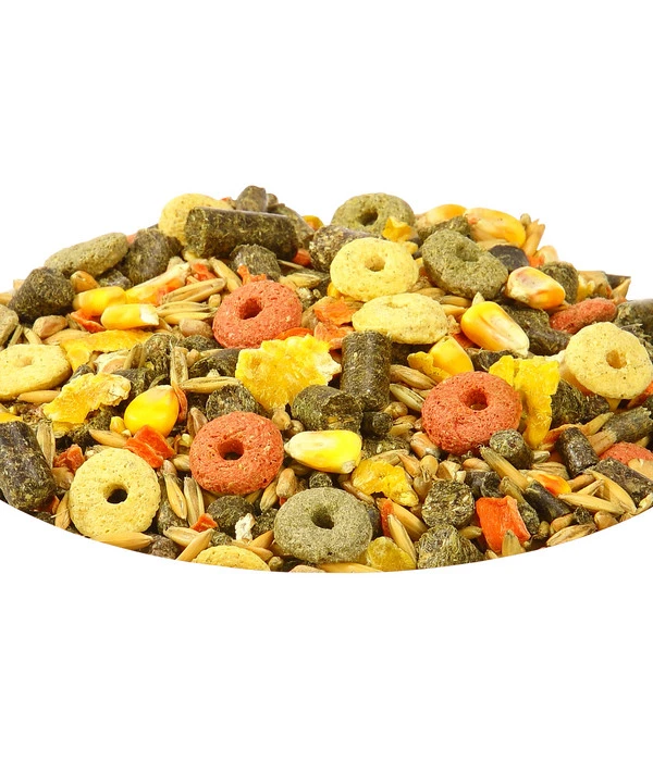 Getreide (u.a. Weizen, Hafer, Mais, Gerste), pflanzliche Nebenerzeugnisse (u.a. 43 % Luzerne), Gemüse (u.a. Karotten), Öle und Fette, Mineralstoffe