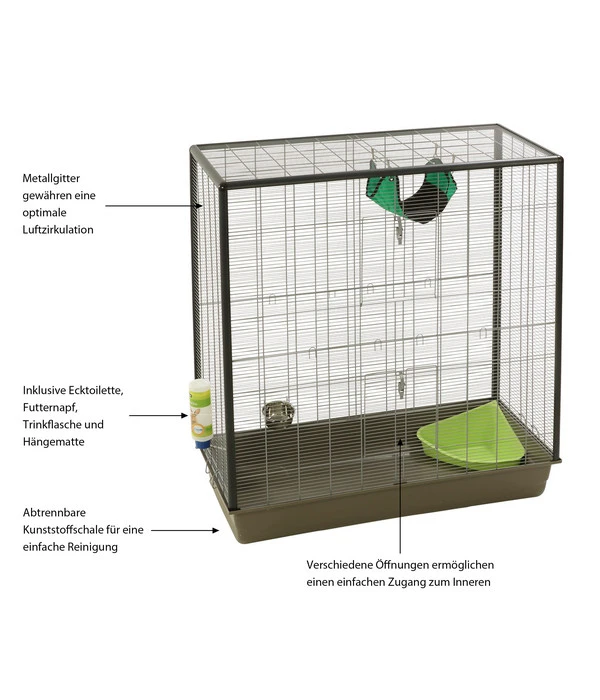 In diesem schönen und extra hohen Dehner Kleintierheim Ratatouille werden sich Hamster von Anfang an so richtig wohlfühlen. Idealerweise ist der Nagerkäfig Ratatouille von Dehner bereits vorab ausgestattet. Eine Ecktoilette, ein Futternapf, eine Trinkflasche sowie eine Hängematte inkl. Befestigungsmaterial sind im Lieferumfang enthalten. So ist bereits für die Hygiene, Futter und Wasser und relaxen oder spielen gesorgt. Über zwei Türen in der Gitterabdeckung vorne und hinten können Sie Ihre Hamster oder Ratten mit Futter, Wasser oder Snacks versorgen. Die Gitterabdeckung lässt sich anhand der Gitterhaken von der Bodenwanne aus Kunststoff trennen und erleichert Ihnen so die Reinigung. Das ansprechende Kleintierheim Ratatouille von Dehner überzeugt mit seiner tierschutzgerechten Größe und der Dehner Markenqualität. In diesem Hamsterkäfig werden sich Ihre Lieblinge bestimmt wohl fühlen.
