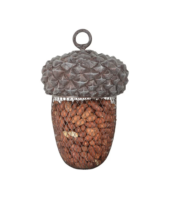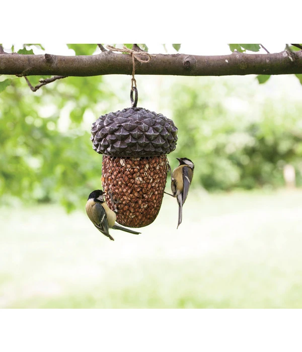 Verfüttern Sie auch gerne Erdnüsse als nahrhaftes Vogelfutter an die Wildvögel in Ihrem Garten? Dann bekommen Sie mit der Dehner Natura Futterstelle Eichel jetzt einen besonders dekorativen Futterspender dafür. Ganz nach dem Motto außen Eichel – innen Erdnüsse. Diese formschöne Vogelfutterstation ist schon ein Hingucker, wenn sie auf dem Balkon oder vor dem Fenster hängt. Aus einer Polyresinhaube und Metall wurde eine Eichel in hochwertiger Qualität nachgebildet, täuschend echt, aber natürlich in Übergröße damit viele Erdnüsse für Ihre gefiederten Freunde darin Platz finden. Selbstverständlich können Sie in diesen schmucken Futterspender neben Erdnüssen, auch Walnüsse oder Haselnüsse einfüllen, die den Vögeln in Ihrer Umgebung schmecken. Dazu lösen Sie einfach die Aufhängeöse vom Futterspender, nehmen den Deckel ab und geben das leckere und nahrhafte Wildvogelfutter hinein. Dank des praktischen Aufhängeringes können Sie die Dehner Natura Futterstelle Eichel überall dort befestigen, wo Sie möchten, egal ob auf dem Balkon, vor dem Küchenfenster oder an einem Ast in Ihrem Garten. Da werden die Vögel in Ihrem Garten aber stauen, wenn sie ihren neuen Futterplatz zum ersten Mal anfliegen.