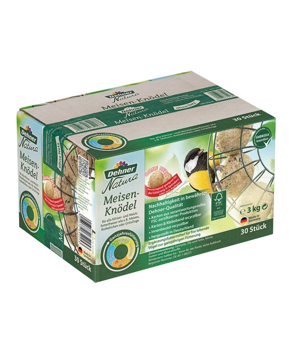 Sie erhalten das Dehner Natura Wildvogelfutter Meisen-Knödel ohne Netz in einem FSC-zertifizierten Karton aus verantwortungsvoller Produktion, der wie das Klebeband recycelbar ist. Da auch der Innenbeutel zu 100 % recycelbar ist, entscheiden Sie mit diesem Vogelfutter für Wildvögel nicht nur für ein bewährtes Produkt, sondern zugleich für ein umweltfreundliches. Noch ein Qualitätsmerkmal: Die Meisenknödel ohne Netz von Dehner Natura werden in Deutschland hergestellt und sind außerdem Ambrosia kontrolliert.