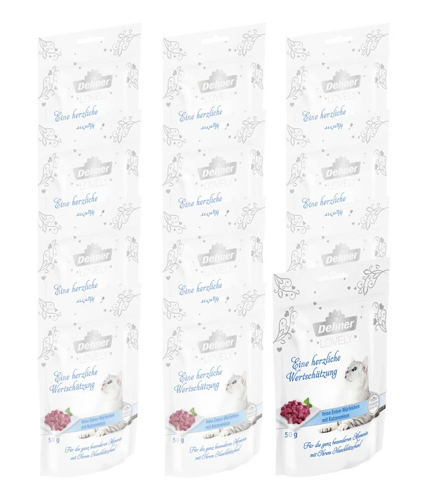 Wenn Sie nach einem anstrengenden Tag nach Hause kommen, werden Sie von einem vertrauten, liebevollen Schnurren begrüßt und ein seidenweicher Körper schmiegt sich um Ihre Beine – gibt es einen schöneren Willkommensgruß? Wir finden nicht. Wir finden aber auch, dass Sie Ihrem Samtpfötchen in solchen Momenten ruhig deutlich zeigen können, wie sehr Sie ihre Gegenwart genießen. Eine besonders leckere Möglichkeit: Öffnen Sie die Tüte Dehner Premium Lovely Katzensnack Eine herzliche Wertschätzung und sagen Sie mit jedem leckeren Bröckchen: ‘Danke, dass du bei mit bist!‘ Da die kleinen Fleischstückchen in diesem Snack aus leckerer Ente bestehen, wird Ihre Katze Ihre Botschaft garantiert verstehen und danach in noch sanfterer Stimmung sein – ideal, um für ein Weilchen zusammen im Sessel zu sitzen und die Gesellschaft der anderen zu genießen. Besorgen Sie sich gleich den Dehner Premium Lovely Katzensnack Eine herzliche Wertschätzung und freuen sich jetzt schon auf die besonderen Momente inniger Zweisamkeit!