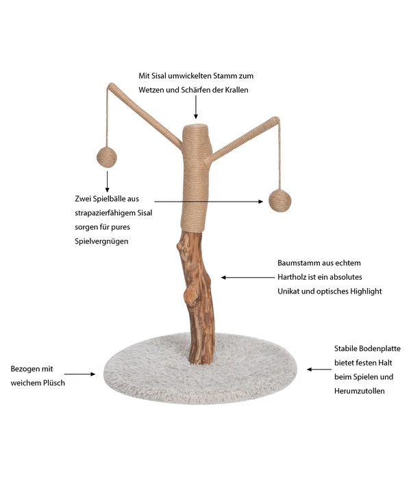 Der Kratzbaum von Dehner Premium Lovely ist mit zwei Spielbällen aus strapazierfähigem Sisal ausstattet, die an einer ebenso stabilen Kordel hängen. Und vielleicht meint Ihre Mieze beim ersten Kennenlernen dieses Spielzeugs, dass man diese Bälle in Nullkommanix fangen kann. Aber weit gefehlt, denn die Bälle entziehen sich natürlich oft den zupackenden Pfoten, was die Jagleidenschaft Ihrer Samtpfote nochmals anstachelt. Kein Wunder, dass sie danach müde ist und sich gerne auf der weichen Plüschunterlage für ein Nickerchen ausstreckt.