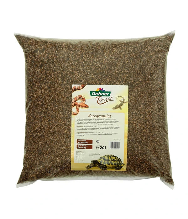 Das Dehner Terra Korkgranulat wird aus der Unterrinde von Korkeichen gewonnen. Der Bodengrund ist ideal für alle Wald- und Savannenterrarien, insbesondere für Reptilien mit einem geringen bis mittelgroßen Bedarf an Luftfeuchtigkeit wie z. B. kleinere Schlangenarten oder Landschildkröten. Die positiven Eigenschaften dieser Holzart machen die Einstreu zu einem idealen Bodengrund. Kork ist elastisch, robust, antistatisch und sorgt dank der wärmedämmenden Fähigkeit für ein stabiles Temperaturniveau im Terrarium. Anwendungshinweis: Die Einstreu kann nach der Reinigung mit heißem Wasser mehrmals verwendet werden. Sammeln Sie jedoch den Kot der Tiere regelmäßig ab.