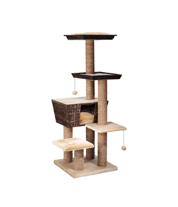 Der ebi Kratzbaum Trend Curacao passt sich, dank seines schicken Designs, in jeden Wohnraum optimal an. Der Katzenkratzbaum verfügt über drei große, kuschelige Liegeflächen und zudem über zwei kleinere Aussichtsplattformen. Hier hat Ihr Tiger sicherlich alles im Blick. Die gepolsterte Katzenhöhle eignet sich nicht nur als idealer Rückzugsort, sondern lädt auch zum stundenlangen Träumen ein. Die im ebi Kratzbaum Trend Curacao verarbeitete gewebte Wasserhyazinthe, einem robusten und reißfestem Naturprodukt, verleiht diesem ein natürliches Aussehen im modernen Look. An zwei der Liegeflächen sind außerdem Plüschbälle befestigt, welche vor allem den Spiel- und Jagdtrieb anreizen. So wird es Ihrer Samtpfote sicherlich nicht langweilig. Vor allem Hauskatzen werden sich an dem ebi Kratzbaum Trend Curacao erfreuen. Die Stämme sind mit natürlichem Sisal umwickelt, sodass sich Ihr Stubentiger jederzeit der Krallenpflege widmen kann. Mit dem ebi Kratzbaum Trend Curacao werden Sie Ihren Tiger glücklich machen.