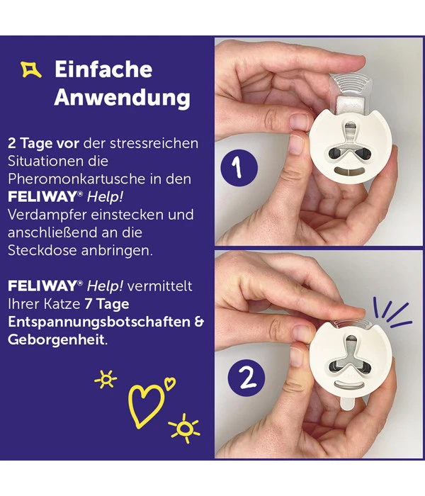Damit die in der Kartusche enthaltenen Entspannungspheromone an die Raumluft abgegeben werden, sollte FELIWAY® Help nicht unter Regalen, hinter Türen, Möbeln und Vorhängen platziert werden. Idealerweise wird FELIWAY® Help zwei Tage vor der bevorstehenden und stressreichen Situation angewendet.