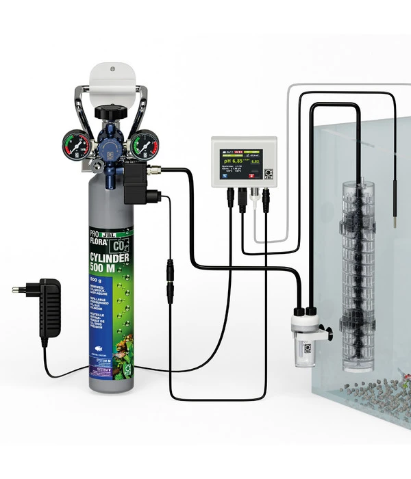 Außerdem hat das JBL PROFLORA CO2 Professional Set M neben vielen anderen Details eine Sensorprüfung bei jeder Kalibrierung und eine Fehlerdiagnose bei fehlgeschlagener Kalibrierung. Die Permanent-Anzeige zeigt: pH Ist-/Sollwert, Sensorspannung, Temperatur, Kalibriererinnerung in Tagen/Stunden, Ventilstatus und Genauigkeit der Messung. Und auch die Installation ist wunderbar einfach: Sie müssen nur den Druckminderer auf die CO2-Mehrwegflasche aufschrauben und durch den Schlauch mit dem Blasenzähler (inkl. Rücklaufsicherung) und dann mit dem Reaktor im Aquarium verbinden – das war‘s! Hinweis: Die pH-Elektrode muss fabrikfrisch hinzuerworben werden.