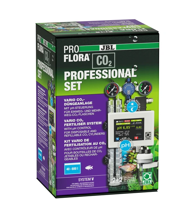 Ganz gleich, welche Wasserpflanzen Sie in Ihrem Unterwasser-Biotop haben – die „grüne Lunge“ hat mehr Aufgaben als mit ihrem Formenreichtum und dem frischen Grün den exotischen Look Ihres Unterwasserparadieses zu unterstreichen. Die Aquariumspflanzen liefern Ihren Fischen lebensnotwendigen Sauerstoff, sie betätigen sich als chemische Filter und bieten den Fischen gute Versteckmöglichkeiten. Und dafür brauchen die Aquariumspflanzen als Hauptnährstoff CO2. Und zwar in genau der Menge, die zur Aquariumsgröße, dem jeweiligen Fischbesatz und noch einigen anderen Variablen abhängig ist. Das JBL PROFLORA CO2 Professional Set V ist eine hochwertige, automatische CO2-Düngeanlage für Süßwasseraquarien von 40 l bis 600, die diese Aufgabe sicher und präzise erfüllt. Lassen Sie bald das JBL PROFLORA CO2 Professional Set V die Pflanzendüngung übernehmen und genießen Sie den Anblick Ihrer fantastischen Unterwasserwelt!