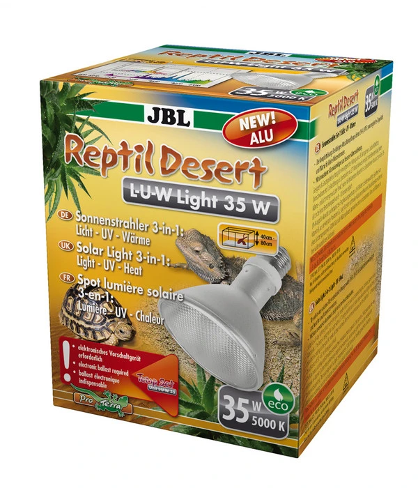 Die JBL Terrariumbeleuchtung ReptilDesert L-U-W Light alu bietet Ihren Wüstentieren UV-Strahlen, sonnengleiches Tageslicht und Wärme, denn erst durch das perfekte Zusammenspiel dieses Trios funktionieren Aktivität, Nahrungsaufnahme, Verdauung usw. der wechselwarmen Terrarienbewohner wie in ihrer natürlichen Umgebung. Der Spot-Sonnenstrahler versorgt Ihre Reptilien sogar mit UV-A- und UV-B-Strahlung. Wie Sie sicher wissen, spielt die UV-A-Strahlung eine Rolle im Sozialgefüge und Sozialverhalten der Reptilien und fördert die Fortpflanzungsbereitschaft, während die UV-B-Strahlung für die Bildung von Vitamin D3 und damit für ein gesundes, starkes Knochengerüst und kräftige Panzer verantwortlich ist.