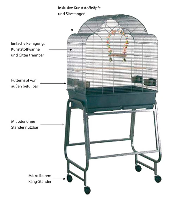 Viel Platz und besonders praktisch: Der Vogelkäfig Memphis II ist ein schönes Heim für Vögel aus schwermetallfreiem Stahl, überzogen mit einer Avilon Pulverbeschichtung, welche speziell für die Vogel- & Nagerhaltung ausgelegt ist. Der Käfig mit Dreibogendach ist mit einer Kunststoffwanne ausgestattet, die sich durch Klickverschlüsse schnell vom Gitter lösen lässt. Das erleichtert Ihnen die Reinigung enorm und verhindert zudem, dass Futterreste, Kot etc. aus dem Käfig herausfallen können. Zusätzlich verfügt der Vogelkäfig über Außenfuttertüren, Kunststoffnäpfe sowie eine Sitzstange. Das Heim für Vögel kann einfach vom mitgelieferten Ständer heruntergenommen werden. Die Innenhöhe beträgt 97 cm, der Gitterabstand 1 cm und die Gitterstärke 0,2 cm. Damit sind Sie von Anfang an ideal ausgestattet.