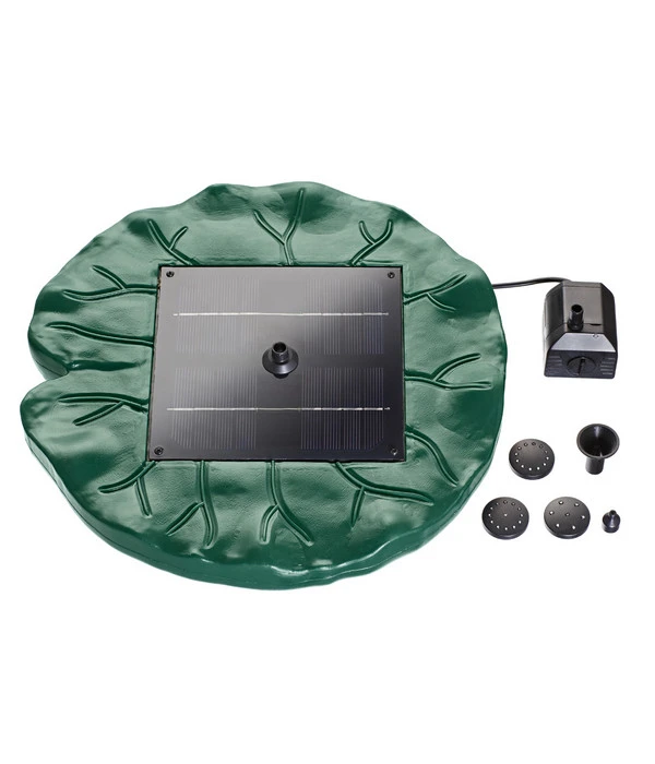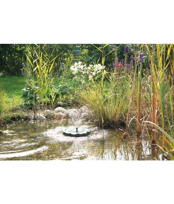 Das Solarstromystem ist in den Farben grün und schwarz gehalten und hat die Form eines großen Seerosenblattes. So fügt es sich in das Aussehen Ihres Gartenteiches ein. Unser Tipp: Platzieren Sie das Gerät, wenn möglich, an einer Stelle ohne Schattenwurf durch Schilf etc. Je mehr Sonnenschein auf das Solarpanel fällt, desto mehr Strom wird für das Wasserspiel produziert. Das Gewicht von 0,6 kg sorgt für stabiles Schweben auf der Wasseroberfläche und ermöglicht ein leichtes Platzieren an der besten Stelle. Der Hersteller gewährt Ihnen zwei Jahre Garantie. Selbst zur Haltbarkeit beitragen können Sie, indem Sie Verunreinigungen rasch entfernen. Auch bei schlechten Lichtverhältnissen bleibt das Wasserspiel in Betrieb, durch die elektronisch geregelte Speicher- und Regeleinheit SolarSafe (optional).