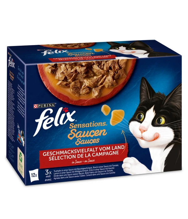 Beim Katzennassfutter Sensations Saucen Geschmacksvielfalt vom Land von PURINA felix® handelt es sich um ein hochwertiges Alleinfuttermittel für ausgewachsene Katzen, für das nur guten Zutaten verwendet wurden. Deshalb sehen die zarten Stückchen Fleisch in der Soße so appetitlich aus und duftet so verführerisch. Außerdem ist das Futter für Katzen in praktischen Portionsbeuteln verpackt, so dass Ihre Samtpfote die saftigen Portionen immer gleich verputzen wird und deshalb kein Futter lange im Fressnapf bleiben und unappetitlich trocken werden kann.