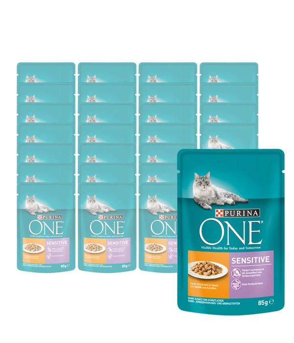 Hat auch Ihre ausgewachsene Katze eine empfindliche Verdauung? Gerade dann ist ein geeignetes Alleinfuttermittel Gold wert: Profitieren Sie von dem hochwertigen PURINA ONE® Nassfutter Sensitive Inhalt und leisten Sie damit einen wichtigen Beitrag zur Gesundheit Ihres Stubentigers.