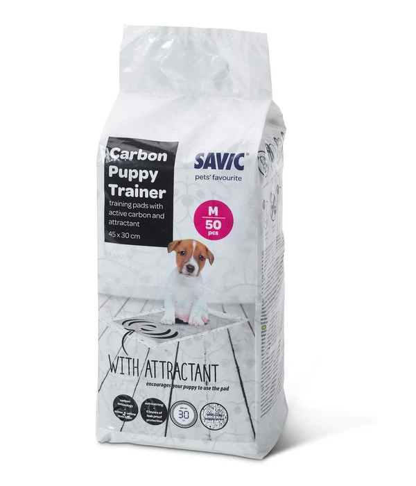 Haben Sie erst kürzlich einen Welpen in einem Tierheim oder bei einem Züchter kennengelernt? War es für beide Seiten Liebe auf den ersten Blick? Lebt das jüngste Familienmitglied bereits bei Ihnen? Dann erleichtern Sie ihm das Toilettentraining, indem Sie für ihn die Hundetrainingsunterlage Carbon Puppy Trainer der Marke SAVIC bestellen! Diese handlichen Matten verfügen über sechs Lagen, weshalb sie auslaufsicher und extrastark sind. Auf diese Weise bleibt Ihnen unnötiges Putzen erspart. Zudem enthalten die Unterlagen einen Pheromon-Lockstoff, der dafür sorgt, dass Ihr Welpe von den Matten beinahe magisch angezogen wird. Dadurch erleichtern Sie ihm das Training, weil er zur Benutzung der Unterlage animiert wird.