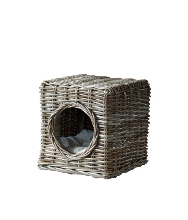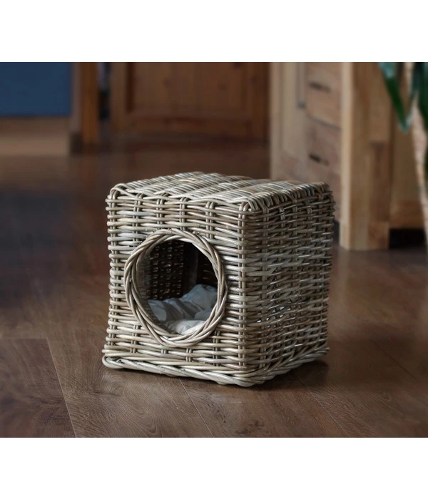 Diese quadratisch-praktisch-schöne Silvio Design Katzenhöhle Milo ist in aufwendiger Handarbeit aus hochwertigem, naturfarbenem Rattan um ein stabiles Holzgestell herum geflochten. Durch den runden Eingang begibt sich Ihr Liebling hinein in die Silvio Design Katzenhöhle Milo und macht es sich auf dem innen liegenden Kissen sicher sehr gern so richtig bequem. Es ist übrigens mit einem strapazierfähigen Baumwollbezug umhüllt, der bis 30 Grad waschbar ist.