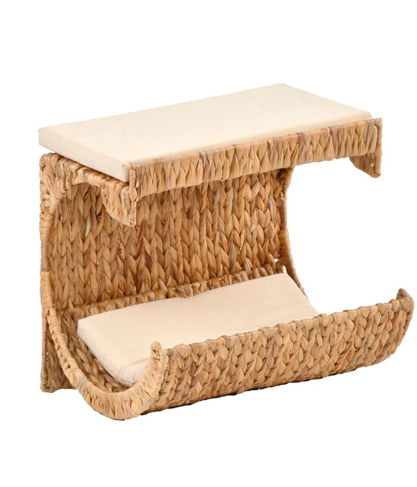 Das optisch besonders ansprechende Material, aus dem die formschöne Silvio Design Katzenliege Cäsar handgefertigt ist, ist ein Naturgeflecht aus Wasserhyazinthe. Für die erforderliche Stabilität und eine stabile Wandanbringung sorgt ein robuster Metallrahmen, der in das Hyazinthengeflecht unsichtbar eingearbeitet ist.