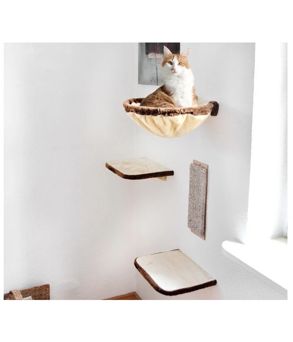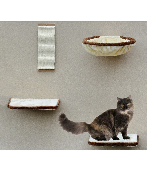 Die vier Elemente können an jede Wand angebracht werden. Die zwei Liegeflächen dienen zum Entspannen oder können zum Klettern genutzt werden, damit Ihre Katze auch in die gemütliche Liegemulde gelangt. In der Liegemulde, die mit kuscheligem Plüsch bezogen ist, wird sich Ihre Katze besonders wohl fühlen. Das Kratzbrett bezogen mit strapazierfähigem Sisalgewebe und somit ideal für die Krallenpflege Ihrer Katze. Mit den klassischen Farben Beige und Braun passt sich der Kratzbaum jedem Wohnraum an. Die vier Elemente können ganz einfach nach eigenen Wünschen und platzsparend an eine Wand montiert werden. Somit ist der individuelle Kratzbaum ideal für alle, die wenig Platz zur Verfügung haben. Das Montagematerial bekommen Sie gleich mitgeliefert.