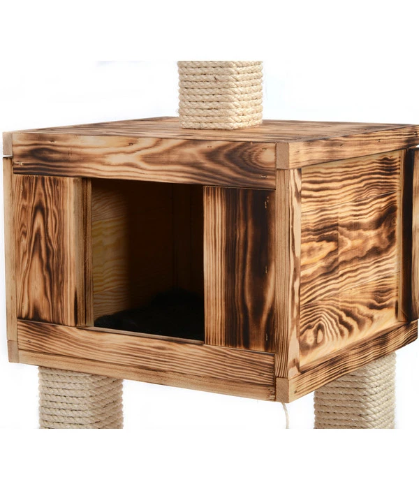 Dieser Katzenkratzbaum bringt Modernität und Geschmack in Ihren Wohnraum. Seine eckige Form wirkt sehr elegant und wird unterstrichen von den drei massiven, dicken Vollholzholmen mit großzügigen 7×7 cm Stärke. So gibt es ausreichend Fläche für ausgiebiges Krallen wetzen! Die Holme sind zudem komplett mit Sisal umwickelt, was für optimale Kratzmöglichkeiten sorgt. Auf drei Ebenen kann sich Ihr Stubentiger auf dem Kratzbaum von Silvio Design aufhalten. Ob zum Liegen, Schlafen oder Sitzen und Beobachten – es gibt genug Auswahl und Abwechslung. Schließlich muss Ihre Katze ihr Reich immer im Blick behalten! Wenn sie sich schließlich von ihren Abenteuern ausruhen will, steht ihr auf ihrem Silvio Design Katzenbaum Finn Junior eine tolle Kuschelhöhle zur Verfügung, die mit einer kuscheligen Plüscheinlage besonders angenehme Stunden verspricht. Sich darin zu verstecken und in Ruhe ein Schläfchen zu halten – welche Katze könnte da widerstehen? Den hohen Komfort auf der Liegeplatte ermöglicht das mit Klettverschluss befestigte Kissen. Durch diese praktische Befestigung können Sie es je nach Bedarf auch abnehmen. Die Möglichkeiten für Ihren Liebling sind abwechslungsreich und vielseitig. So wird ihm sicher nicht langweilig und Sie freuen sich über Ihre aktive, fröhliche Katze und ein dekoratives Einrichtungsstück. Spiel, Spaß, Ruhe und Krallenpflege – das alles bietet dieser Silvio Design Kratzbaum Finn Junior, ein Katzenkratzbaum aus hochwertigen Materialien mit dem gewissen Extra.