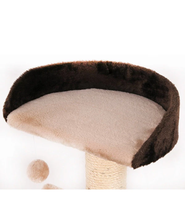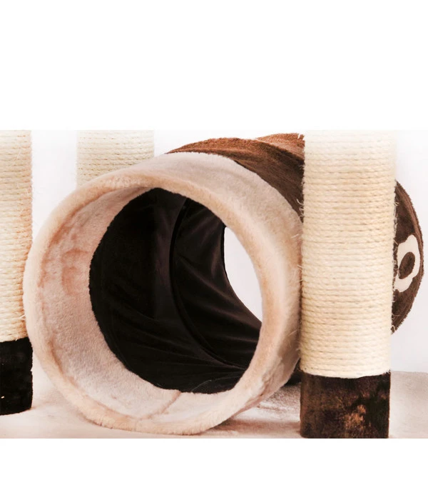 Ein kompakter und dennoch vielseitiger Kratzbaum, der für eine ausgiebige Unterhaltung Ihrer Katze sorgt. Der auf der Bodenplatte befestigte Tunnel stellt das perfekte Spielversteck dar. Die darüber liegende weiche Liegemulde ist das perfekte Plätzchen, um nach ausgiebigem Spielen mit der darüber angebrachten Spielkugel zu Entspannen. Auf dem höher gelegenen, halbrunden Liegeplatz mit Lehne kann sich Ihr Liebling ausruhen oder er bietet Ihrem kleinen Beobachter ein ideales Aussichtsplätzchen. Alle Liegeflächen sind mit weichem und kuschligem Plüsch bezogen. Für Standfestigkeit sorgt die kompakte Bodenplatte. Die mit Sisal umwickelten Holme bieten Ihrer Katze ausreichend Kratzmöglichkeiten für die wichtige Krallenpflege. Durch das attraktives Design, mit aufeinander abgestimmten Brauntönen und einer farblich angepassten Zierblume am runden Spieltunnel, überzeugt der Kratzbaum zu guter Letzt komplett.