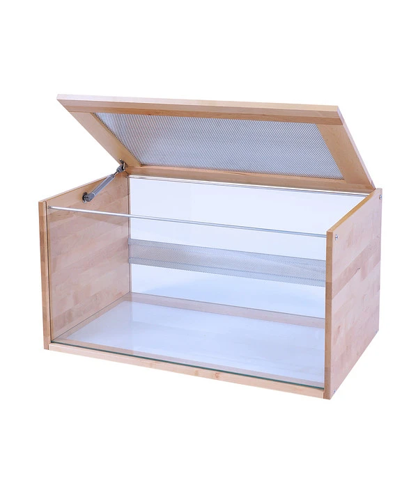 Das Skyline Nagerheim ist an den Seiten aus Holz und an der Boden-, Front- und Rückseite aus Glas gefertigt. Für eine optimale Luftzirkulation sorgt eine integrierte Belüftung in der Glasrückwand und Abdeckung. Dank der komfortablen Servo-Öffnung der Abdeckung gestaltet sich der Zugang zum Innenbereich zudem äußerst einfach. Dies erleichtert Ihnen das Füttern und Reinigen sowie das Einsetzen und Herausnehmen Ihrer Tiere. Ebenfalls praktisch: die Frontscheibe ist nach oben herausziehbar, wodurch die alte Einstreu schnell ausgetauscht werden kann. Nach getaner Arbeit laden die Glasscheiben des Nagariums dazu ein, Ihre Lieblinge beim ausgiebigen Graben, Wühlen und Buddeln zu beobachten. Bestellen Sie jetzt den Skyline Nagerkäfig Marrakesch und schaffen Sie Ihrem Haustier ein Heim zum Wohlfühlen!
