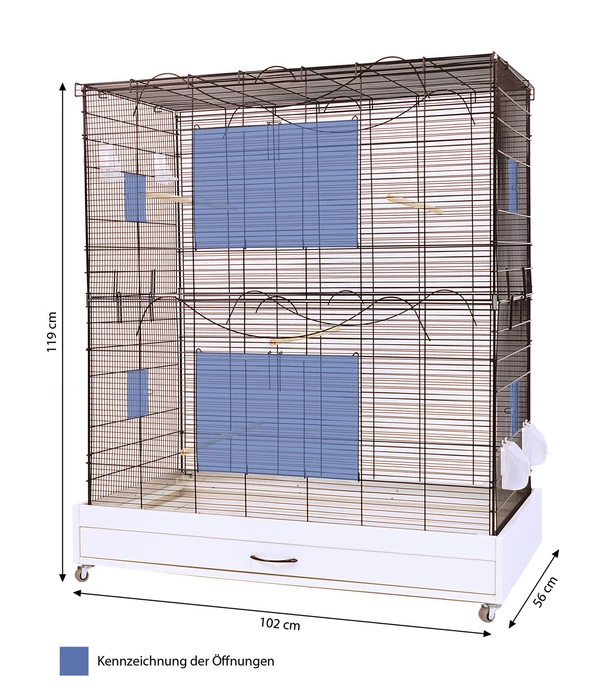 Der Vogelkäfig Yasmine zeichnet sich durch eine besonders angenehme Handhabung aus. Zwei große Klappen vorne und zwei Türen bieten einen einfachen Zugang. Sehr praktisch: auch das Dach lässt sich bei Bedarf vollständig abnehmen. Damit das Reinigen nicht zu einer zu anstrengenden Aufgabe wird, ist der Vogelkäfig Yasmine mit einer ausziehbaren Bodenwanne versehen. Vier Gummirollen ermöglichen zudem ein komfortables Bewegen des Käfigs. Darüber hinaus ist die Voliere sehr wertig verarbeitet, sodass Sie viele Jahre im Einsatz bleiben kann. Bestellen Sie jetzt diesen Vogelkäfig und schaffen Sie ein tolles Heim für Ihre Vögel!