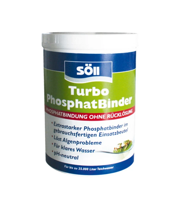 Mit dem Söll Turbo Phosphatbinder binden Sie Phosphat blitzschnell und kinderleicht. Natürlich ist Phosphat in geringen Mengen ein wichtiger Nährstoff für alle Organismen. Jedoch führt eine Konzentration von 0,035 mg/l zu Algenwuchs und massenhafter Algenplagen. Daher muss Phosphor gebunden werden um Algenblüten vorzubeugen. Mit dem Söll Turbo Phosphatbinder ist das kein Problem mehr. Der Söll Turbo Phosphatbinder kann direkt in den Filter eingebracht werden, hier sind die Körbe in den TITAN-Filtern optimal geeignet. Zudem trübt und färbt der Söll Turbo Phosphatbinder das Wasser nicht und ist frei von jeglichen Schwermetallen sowie Aluminiumsalzen. Der Söll Turbo Phosphatbinder ist für den schnellen Abbau von Phosphatspitzen bestens geeignet. Die Anwendung des Söll Turbo Phosphatbinder ist kinderleicht, denn Sie müssen den gebrauchsfertigen Einsatzbeutel nur kurz unter fließendem Wasser abspülen und direkt in den Filter einsetzen. Der Söll Turbo Phosphatbinder Beutel muss komplett von Wasser umgeben sein und durchspült werden. Für eine kontinuierliche Phosphatbindung wird als Anschlusspflege PhosLock AlgenStopp empfohlen. So gehen Sie Algenfrei durch die Teichsaison.