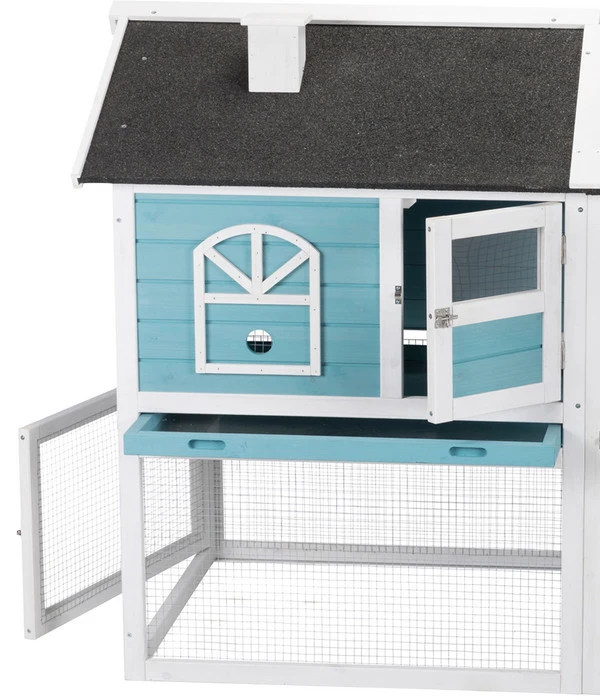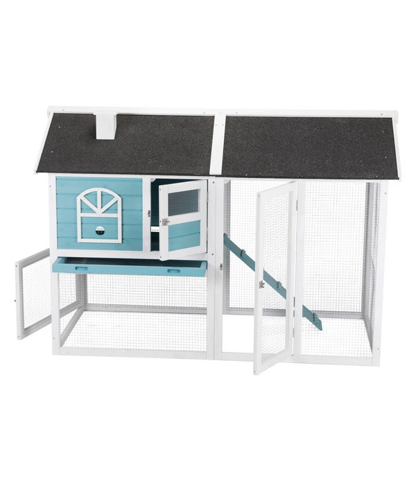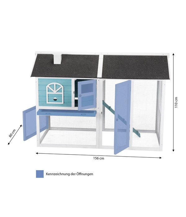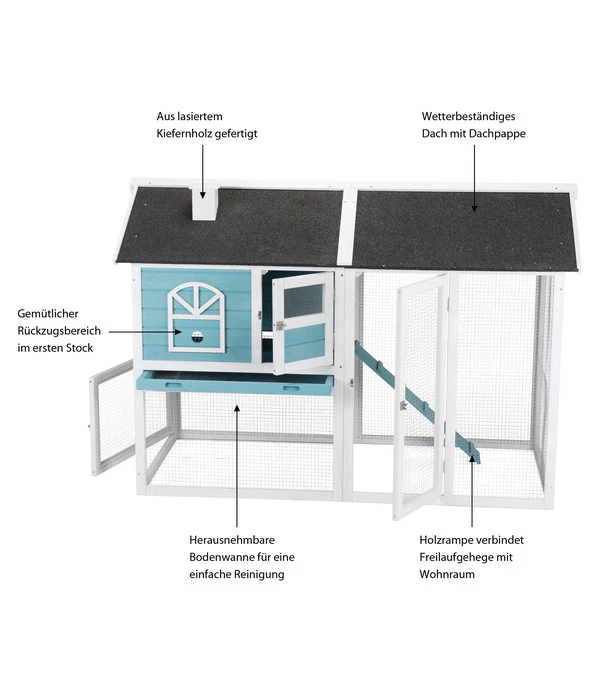 Der Kaninchenstall mit Freilaufgehege ist eine Bereicherung für Ihren Garten. In freundlichem Weiß und frischem Blau erinnert es an ein nordisches Ferienhaus. Das Dach schmückt sogar ein kleiner Kamin! Der hochwertige Stall wurde aus lasiertem Kiefernholz angefertigt und das Dach mit Dachpappe überzogen – er ist also wetterfest und eignet sich ideal zur Außenhaltung Ihrer kleinen Freunde.