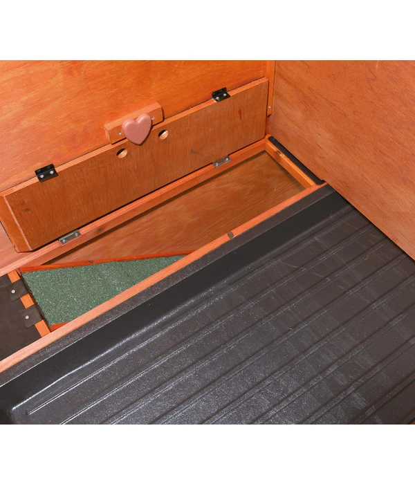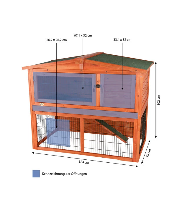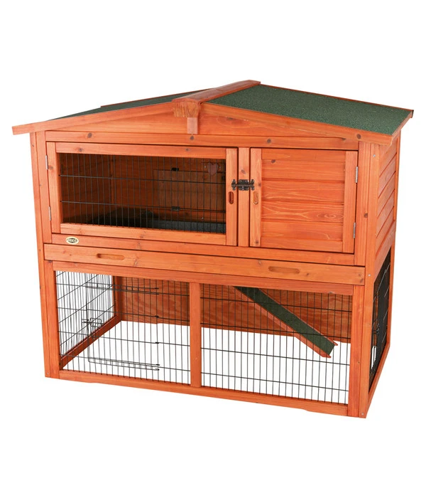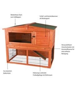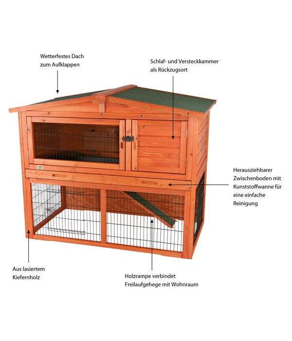 Auf zwei Etagen bietet dieser mit umweltfreundlicher Lasur versehene Holz-Stall viel Platz für Kaninchen und Meerschweinchen. Neben dem großzügigen Freilaufgehege, in dem sich die Tiere direkt auf Rasen bewegen können, bietet der Kaninchenstall im oberen Stockwerk einen gemütlichen Rückzugsort mit zusätzlicher Schlafhaus. Besonders vorteilhaft für die Reinigung sind der herausnehmbare Zwischenboden des Stalls und das aufklappbare Dach, welches zudem mit wetterfester Teerpappe bespannt ist.